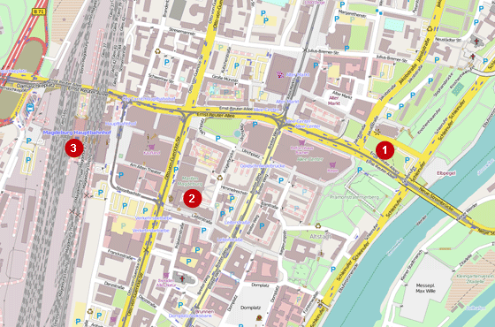 Bitte auf der u. s. Karte die Nr. 2 (Maritim Hotel Magdeburg) und die Nr. 3 (Hauptbahnhof) aufsuchen